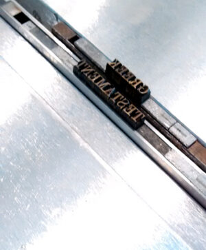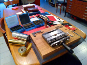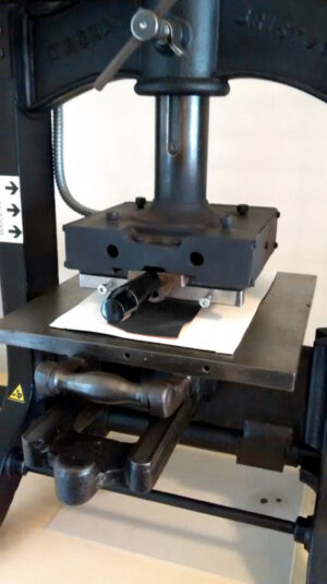 Gold and silver titling is created by a hot press using typeface to transfer the foil image onto the material. Each letter and space is set by hand and locked into a frame for printing. The frame is then set into a temperature controlled press and registered to the correct alignment for printing. Once the title is tested, the material is placed onto the bed, metallic foil sheet inserted and the arm is pulled down to create a layer of gold or silver foil. Several layers are applied to create a title.