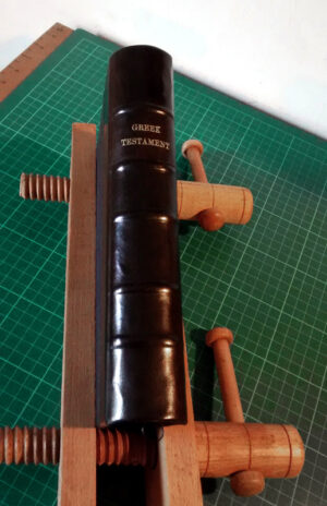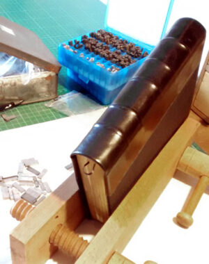 Unlike sending a document from a computer to a printer, metallic foil blocking requires a typeface form created individually by hand for each title regardless of how many volumes are being made. For a single volume this can require considerable time if text is needed for both covers and spine.