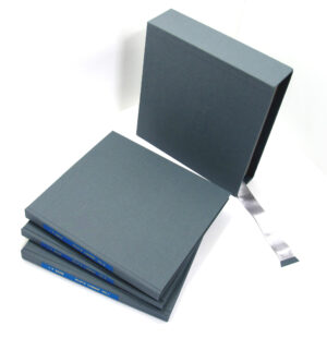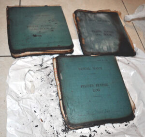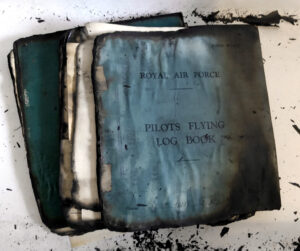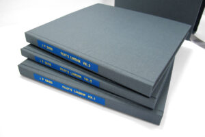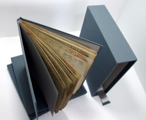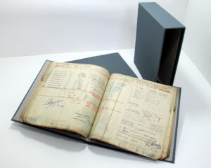 Pilot’s Log Books are the indispensible record of a pilot’s career recording the complete details of each journey to create a unique historical document. This set of three log books from our client’s grandfather’s career with the Royal Air Force had suffered considerable damage in a house fire before arriving in our studio for cleaning and reconstruction. We also created a bespoke slide case with pull ribbon to house and protect these records for the future.