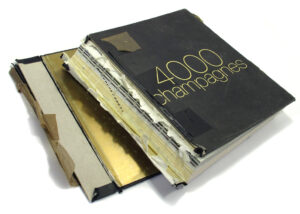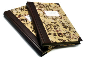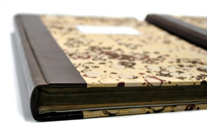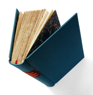 Histories and text books don’t have to be antiquarian to be worth preserving and collecting. This contemporary oversize volume on the history and culture of champagne was repaired and rebound with extra internal support cords and finished in fine Moroccan with raised corded spine and corners, gilt titling, hand marbled endpapers for a private collection.