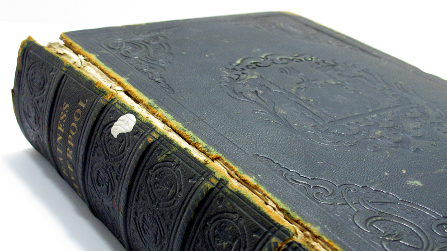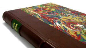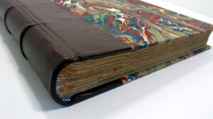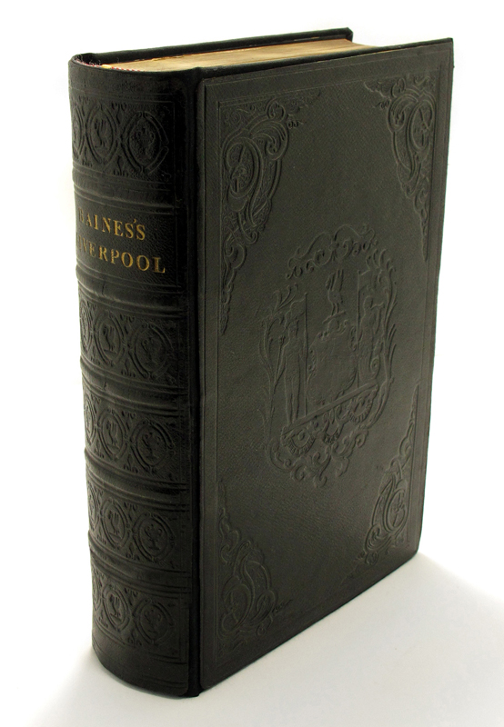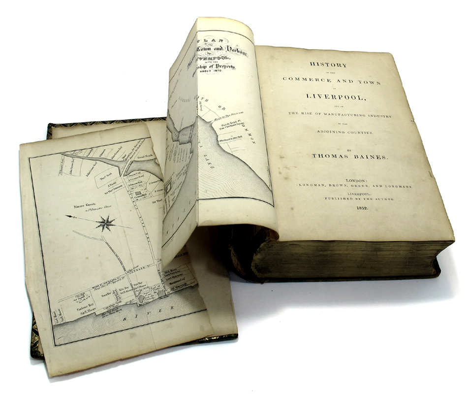 This volume of Baines’ ‘History of Liverpool’ has been handed down through our client’s family for generations and had been stored in inadequate conditions for decades. This volume was thoroughly cleaned, paint removed from the leathers, extensive paper repairs done, especially on the fold out maps, and finally rebound onto strong internal cord supports. Finished with new headbands, page ribbon and hand marbled endpapers, the original cover leathers were redyed, preserved, polished and remounted to preserve the orginal look and feel of this wonderful local history.