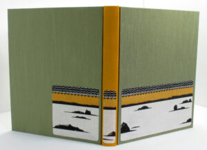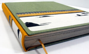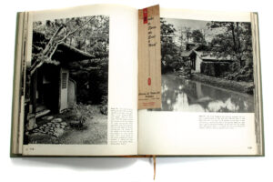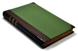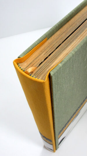 This 1951 volume ‘Japanese Garden Design’ was rescued from disrepair by a keen enthusiast of Asian cultures. Much of the orignal cover materials had been destroyed. We created a stylish and suitable new Bradel binding in a sympathetic colour scheme to match what remained of the orginal silk screened cloth, rebound the volume with matching headbands, page ribbon and Japanese silk endpapers for this private collector.