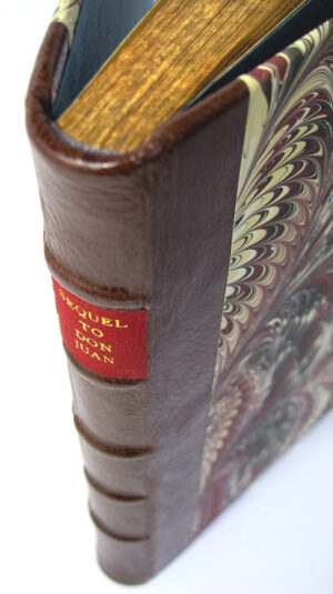 ‘Sequel to Don Juan’ repaired and rebound in raised cord binding, leather spine and corners, hand marbled covers, gilt spine titling for private collection.