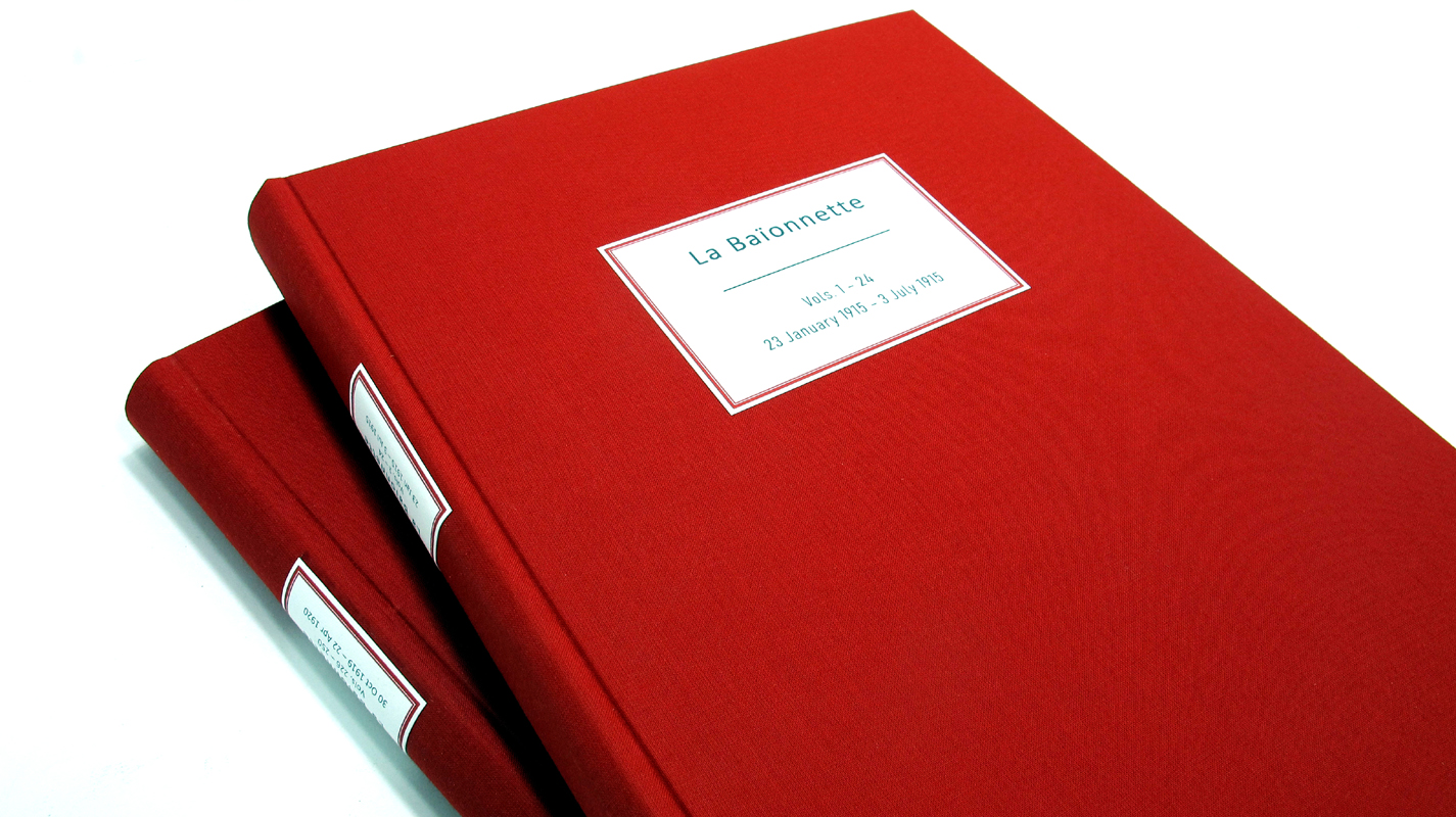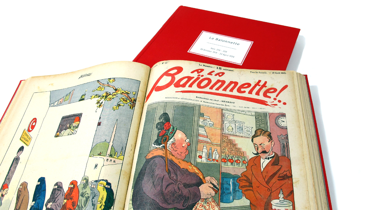 ‘La Baionnette’ magazine was created in France for soldiers serving on the front lines. This complete collection was bound for special private archives to preserve and protect this wonderful historical magazine, an artefact of its time. Full of colourful illustrations, topical humour, jokes, caricatures and even adverts it helped support morale and unity among the troops during incredibly difficult times.